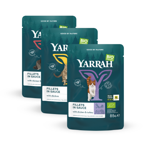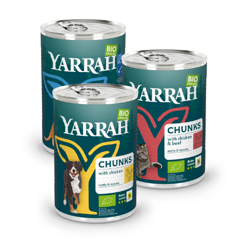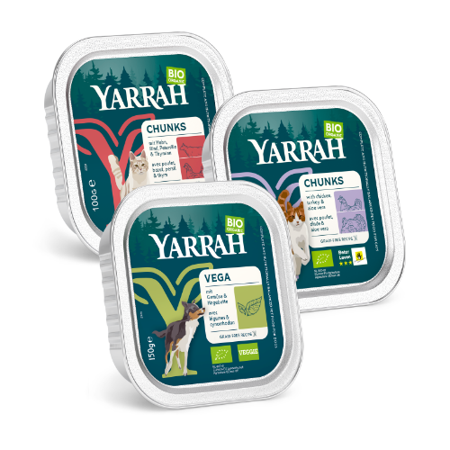 De kuipjes met natvoer van Yarrah zijn van aluminium met een papieren etiket en/of plastic booklet en worden aan de retail geleverd in een tray van golfkarton.