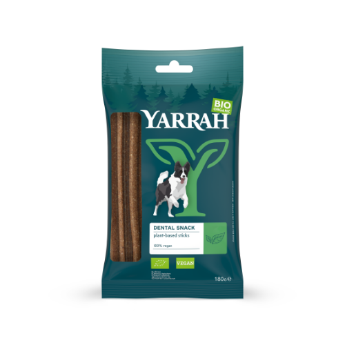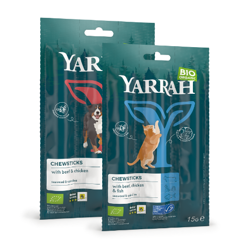 De chewsticks van Yarrah worden geleverd in een plastic verpakking. Voor de retail zijn de snacks geplaatst in een omdoos van golfkarton.