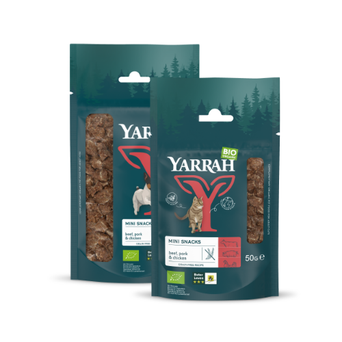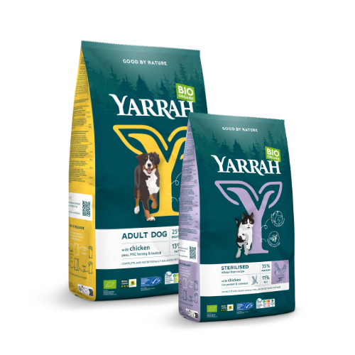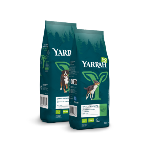 Yarrah’s nieuwe droogvoerverpakkingen zijn milieuvriendelijke, PFAS-vrije papieren verpakking met afscheurbare plastic voering.